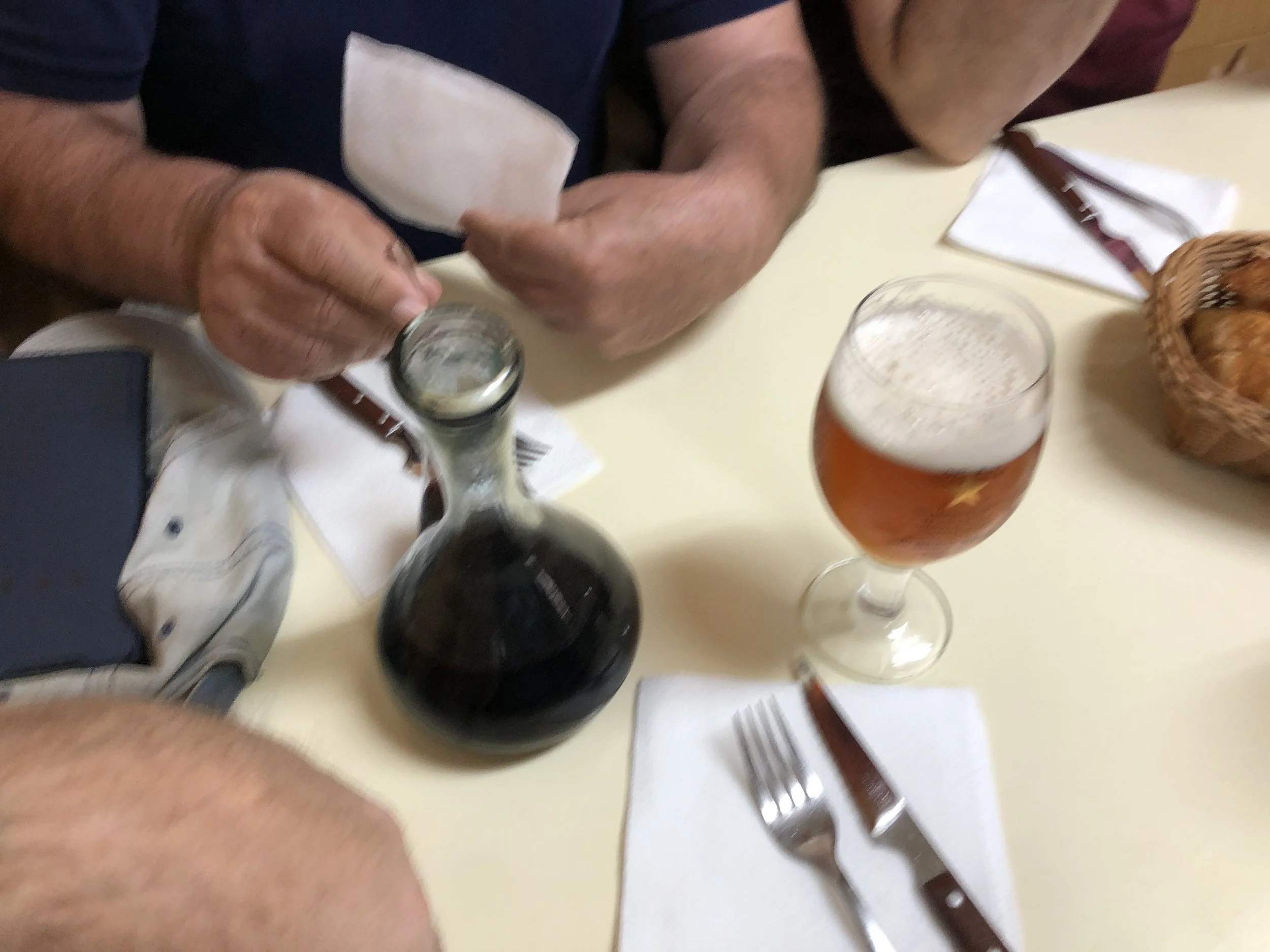 Yesterday, we (only four of us this time) met up at 9:30am (like always) and headed over to Bar Gelida (since 1946) near the Urguell metro stop. The fifth couldn’t join us because she was taking care of some administrative issues with her unemployment. We were seated within 10 minutes of arriving to a packed restaurant. Since we all had our morning coffee at home, we dove right into the wine and beer. Albert is my sherpa at breakfast and orders for me. Within minutes of taking a sip of my first beer, I’m staring down on a piping hot plate of Callos (tripe) simmered in a tomato sauce. This is a dish that evokes a lot of emotion in people. Most people find it disgusting. I find it to be a culinary masterpiece that is known to cure hangovers and depression. After washing it down with my second beer, I sopped up the sauce with some crusty bread. The next plate of food to arrive was the Brau (roasted pork jowel). Usually the tripe is a tough act to follow, but the roast pork fell off the bone and I enjoyed it with my third beer of the morning. After that cholesterol raising pork duet, a carajillo of rum followed by a digestive of whiskey rounded out this glorious morning.